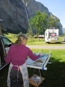 | ADDIE SILK ART Plein Air Silk Painting in Europe Here is an art and travel book with over 270 colored photos of locations, sketches, watercolors, silk art in progress and finished silk art. Included is an Information Chapter describing the process and materials for Plein Air Painting on Silk and Basic Painting on Silk. This colorful 128 page spiral bound book is printed on heavy coated stock. For 4 months Addie and Mike camped in Belgium, England, Netherlands, Luxembourg, France, Switzerland and Italy. Addie shows Plein Air Painting on Silk in nature to be an emotional, colorful and magical experience. To order go to Dharma Trading (800) 542-5227 |