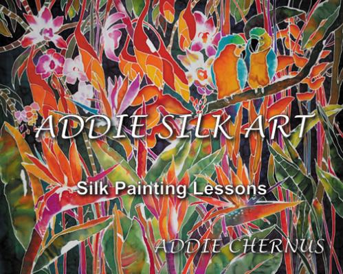 | ADDIE SILK ART Silk Painting Lessons A lavishly illustrated educational silk painting book containing 10 lessons. The lessons teach in a step by step manner how to paint on silk using steam set dyes. This spiral bound 68 page book has over 95 colored images printed on heavy coated cover stock. "My book will enhance your painting skills and bring you joy!" To order go to Dharma Trading (800) 542-5227 Dharma Trading Company |